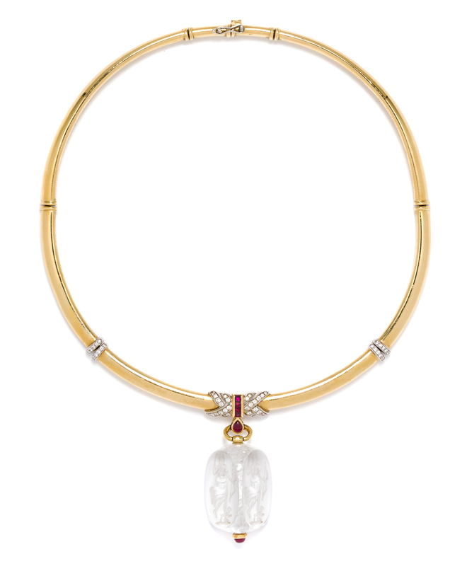 consisting of pendant containing a reverse intaglio cut rock crystal depicting the goddess Diana the huntress set with gold fittings and accented with a cabochon cut ruby at the base, the pendant suspended from a hinged sectioned collar necklace containing 52 round brilliant cut diamonds weighing approximately 0.69 carat total, one pear shape cabochon cut ruby, and three square step cut rubies.