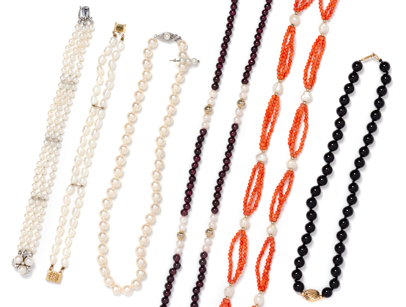 consisting of a necklace containing three strands of coral beads measuring approximately 2.85 mm in diameter gathered at intervals by 11 pearls measuring approximately 6.96-7.21 mm and 22 gold beads, a necklace containing 40 onyx beads measuring approximately 7.84 mm in diameter, one twisted oval gold bead and two polished gold beads strung knotted with a 14 karat gold clasp, a necklace containing numerous garnet beads measuring approximately 4.46-6.08 mm in diameter, 20 pearls measuring approximately 5.46 mm in diameter and five ribbed gold beads, a necklace containing 48 pearls measuring approximately 7.07 mm in diameter strung knotted with a clasp containing one pearl measuring approximately 4.50 mm in diameter, a bracelet containing three strands of numerous pearls measuring approximately 4.00-4.50 mm in diameter strung knotted with three spacer bars and a clasp containing three pearls measuring approximately 6.37 mm in diameter and seven round single cut diamonds weighing approximately 0.07 carat total, together with a bracelet containing two strands of numerous pearls measuring approximately 7.10 mm in length strung knotted with gold spacer bars and a 14 kart yellow gold clasp.