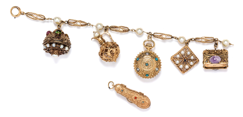 consisting of a yellow gold openwork rope texture link bracelet accented with cultured pearls, the bracelet supporting five yellow gold charms including an articulated treasure chest set with moonstones, a rope texture cagework containing cultured pearls, an imitation pocket watch set with pearls and turquoise, an openwork water pitcher, and a fob pendant containing gems and pearls, together with a loose articulated yellow gold charm in a violin case motif containing a realistic gold violin, and an additional bracelet link.