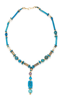 A Gold Tone, Glass, Rock Crystal, and Faience Bead Necklace, Egyptian,