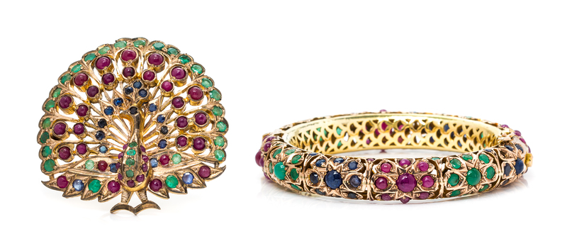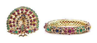 consisting of a hinged yellow gold bangle bracelet set with 40 round cabochon cut rubies, 44 round mixed and round cabochon cut emeralds, and 40 round mixed and round cabochon cut sapphires, together with a similar brooch in a peacock motif set with 30 round mixed cut emeralds, 37 round cabochon cut rubies, and 17 round mixed cut sapphires.