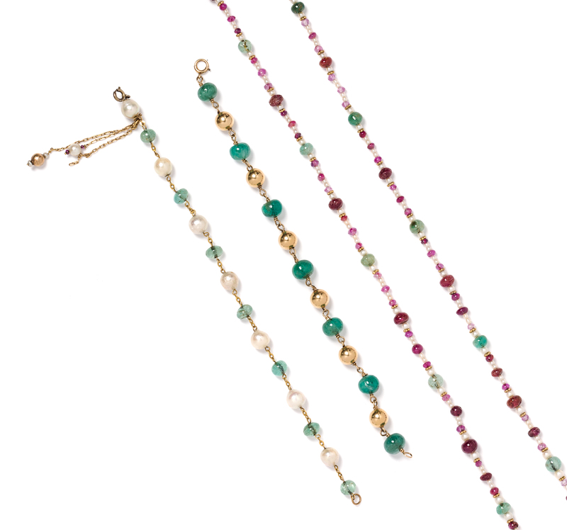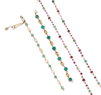 consisting of a 14 karat yellow gold, ruby, emerald, pearl necklace,containing numerous ruby 2.76-6.83 mm in diameter, 15 emerald beads measuring approximately 5.72-6.47 mm in diameter, and numerous pearls measuring approximately 2.15-3.15 mm in diameter strung with gold granulated spacer beads and a 14 karat gold clasp, a 14 karat yellow gold and emerald bead bracelet containing seven emerald beads measuring approximately 8.51-9.30 mm and diameter and six gold beads measuring approximately 7.90 mm in diameter together with a gold tone, emerald and pearl bead bracelet containing seven emerald beads measuring approximately 7.08-7.21 mm in diameter and eight pearls measuring approximately 5.05-7.75 mm in diameter.