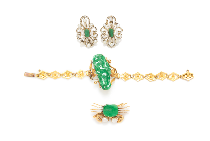 consisting of a high karat yellow gold bracelet containing a central carved dragon motif jade plaque measuring approximately 38.00 x 14.00 mm and scalloped navette shaped links with floral centers, a high karat yellow gold crab motif brooch containing one oval buff top jade plaque measuring approximately 14.67 x 12.01 mm and two pearls measuring approximately 6.20 x 5.40 mm, together with a pair of gilt metal earrings containing two oval jade plaques measuring approximately 8.34-4.48 mm and numerous pearls.