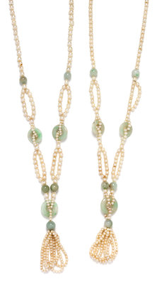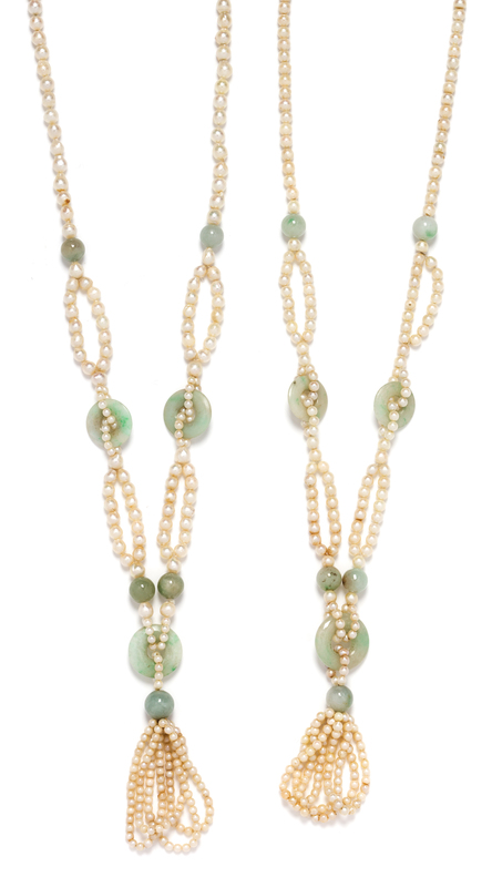 A Pair of Cultured Pearl and Jadeite Jade Tassel Necklaces,