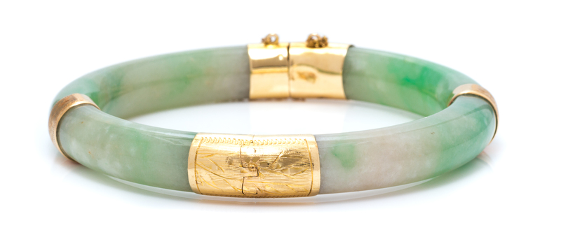 consisting of four mottled green jade sections measuring approximately 9.56 mm wide joined by two yellow gold bands and a yellow gold hinge and clasp.Stamp: CKG 585 14K.
