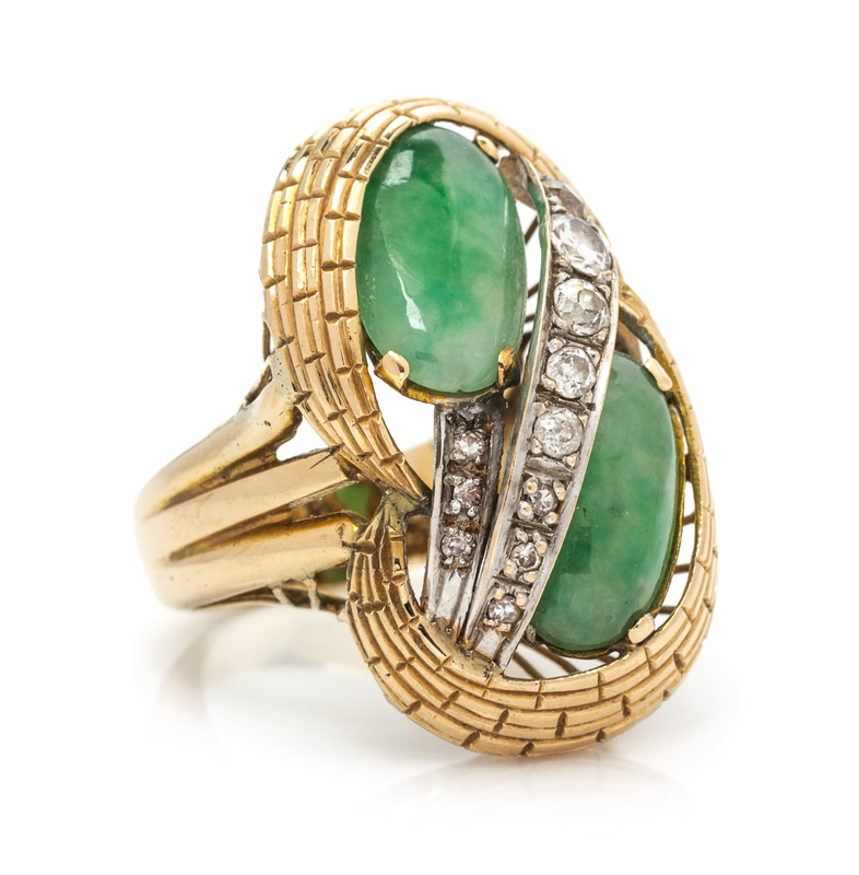 containing two oval cabochon cut jade measuring approximately 13.94 x 8.87 x 2.90 mm and 11 old mine, round brilliant and single cut diamonds weighing approximately 0.44 carat total.