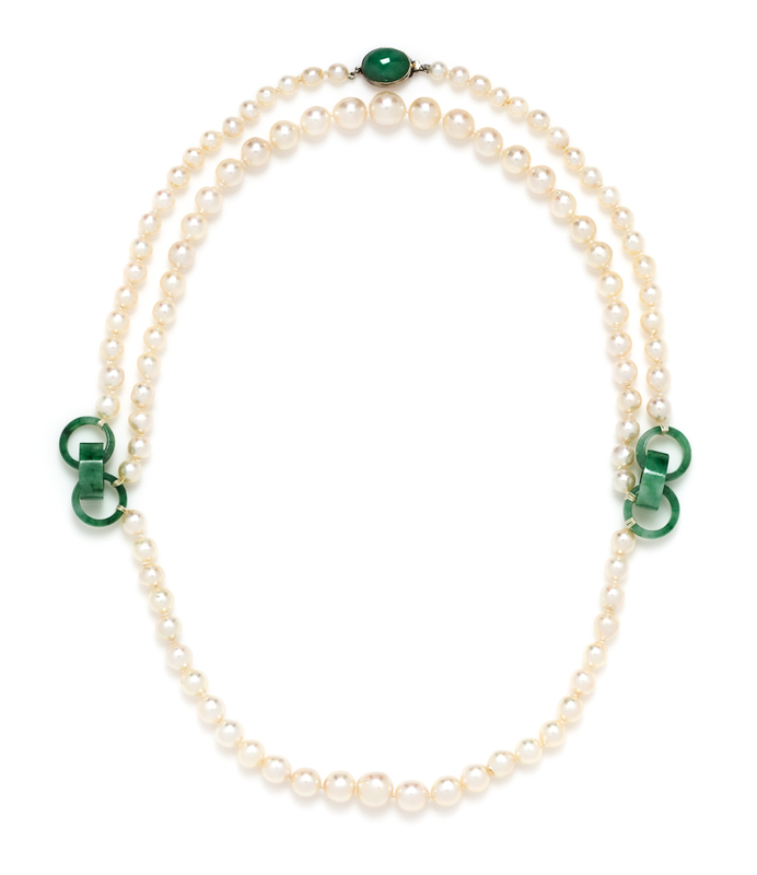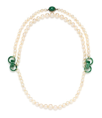 A White Gold, Jadeite Jade and Cultured Pearl Swag Necklace,
