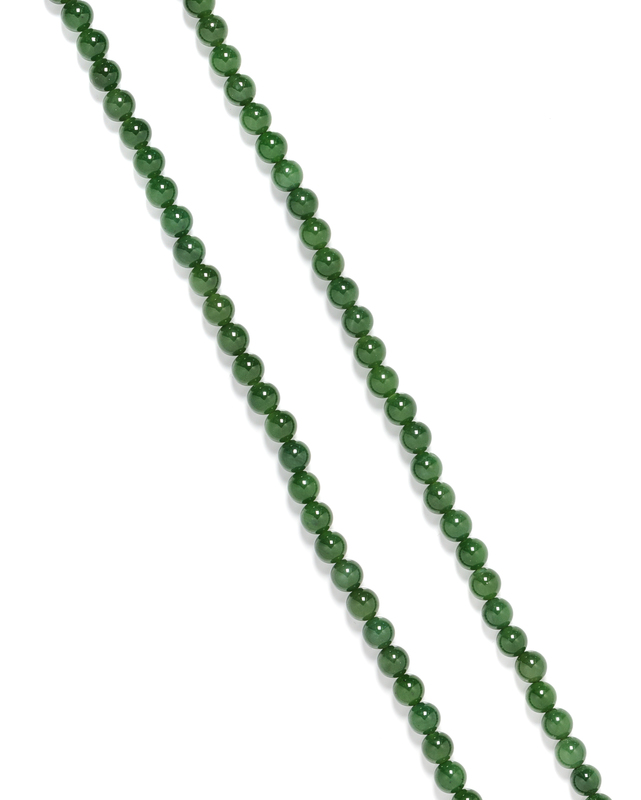 containing 102 nephrite jade beads measuring approximately 7.82-7.97 mm in diameter strung with an 18 karat rose gold clasp.Stamp: 18K.