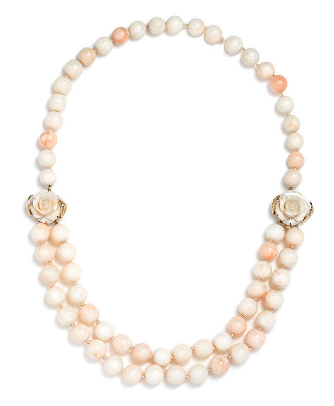 containing 62 angel skin coral beads measuring approximately 9.93-11.55 mm in diameter strung knotted in a swag style with two carved angel skin coral roses at the side and a 14 karat yellow gold clasp.Stamp: 14K.