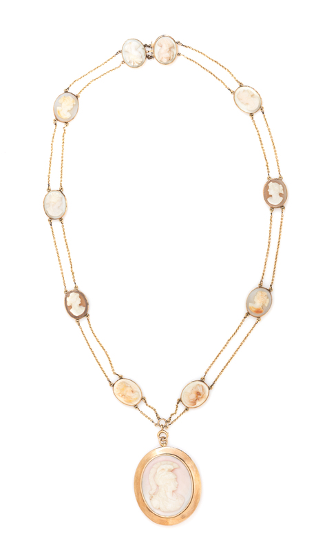 consisting of a central removable pendant/brooch containing a carved conch cameo of a Roman soldier in profile suspended from a double strand chain necklace interspersed with ten carved agate cameos of female profiles.