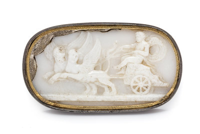 composed of a silver outer and yellow gold inner surround encasing a white hard stone fragment, possibly Ancient, depicting a Classical scene of a chariot being drawn by two figures, a man and a woman, with lion bodies and wings.