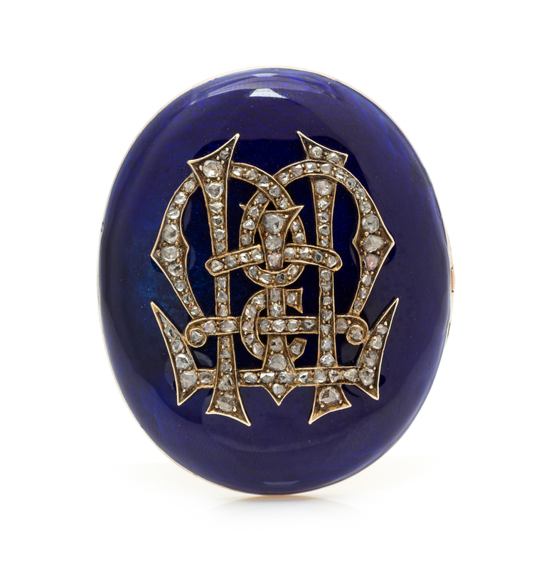 composed of a domed oval plaque accented with translucent blue enamel over textured ground, the plaque surmounted with an intricate openwork section depicting a monogram and containing numerous rose cut diamonds.