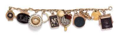 consisting of a Victorian 18 karat yellow gold charm locket with a central onyx plaque and black enamel accent, a rose gold and onyx intaglio, a yellow gold and cultured pearl rotating globe charm, a yellow gold and sapphire charm, a rose gold and mixed metal double sided shakudo locket charm, an egg shaped bone charm, an ancient coin and snake motif charm, a hunting dog and carnelian charm, a rose gold, bloodstone and carnelian fob charm, a ruby, sapphire and cultured pearl boat charm, a Spanish 1867 4 escudos coin charm, together with a rose gold and onyx intaglio locket/fob charm.