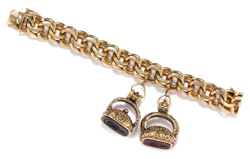 A Yellow Gold Link Bracelet with Two Attached Hardstone Intaglio Fobs,