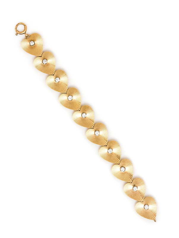 consisting of 10 heart motif links with engraved radials lines surmounted with 10 round brilliant cut diamonds weighing approximately 1.20 carats total.Clasp stamp: 14KT.