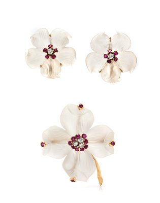 consisting of a brooch containing a frosted rock crystal flower surmounted with 13 round mixed cut rubies measuring approximately 2.30 mm in diameter and three round brilliant cut diamonds weighing approximately 0.16 carat total, together with a matching pair of earclips containing two frosted rock crystal flowers surmounted with ten round mixed cut rubies measuring approximately 2.00-2.20 mm in diameter and two round brilliant cut diamonds weighing approximately 0.14 carat total.Stamp: 14K.