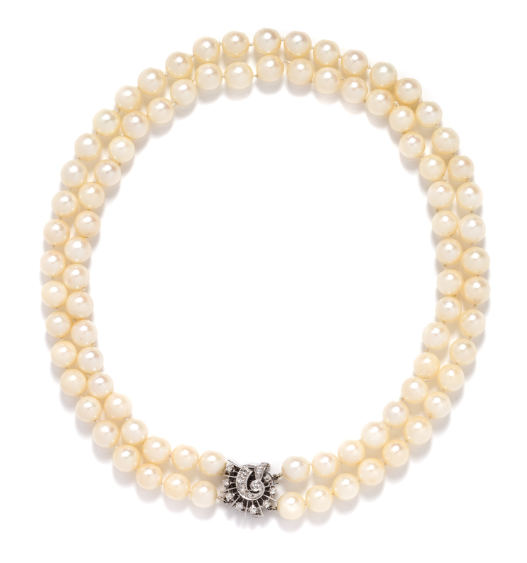 A 14 Karat White Gold and Diamond Double Strand Cultured Pearl Necklace,