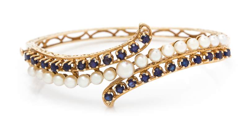 A Yellow Gold, Sapphire and Cultured Pearl Bangle Bracelet,