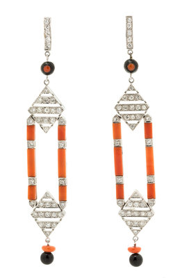 A Pair of Platinum, Coral, Diamond and Onyx Earrings,