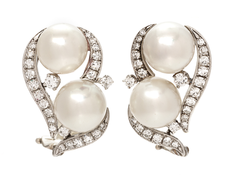 A Pair of 18 Karat White Gold, Cultured Pearl and Diamond Earclips,