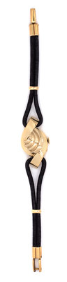 consisting of a swirled bypass style hinged cover, 35.00 x 18.00 mm case dimensions including lugs, matte silver dial signed LeCoultre, applied gilt and index numerals, gilt sword hands, snap on case back, manual wind 17 jewel movement signed LeCoultre Co, black leather cord strap, gold plated foldover clasp.Inner case back stamp: CASED AND TIMED IN U.S.A BY LE COULTRE 001182.Case back stamp: 14K.