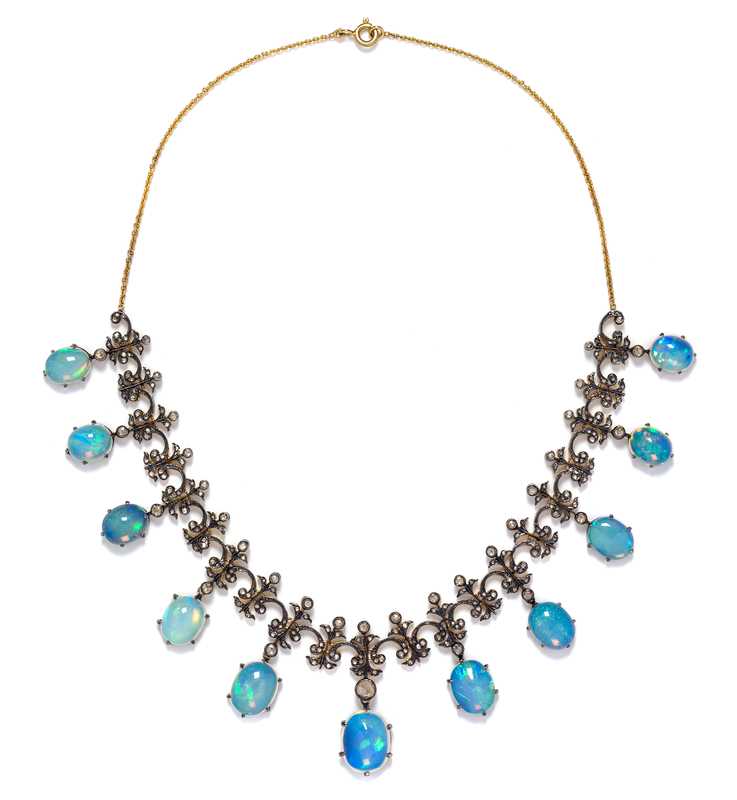 consisting of hinged filigree plaques containing 11 oval cabochon cut opals weighing approximately 30.34 carats total and numerous rose cut diamonds.