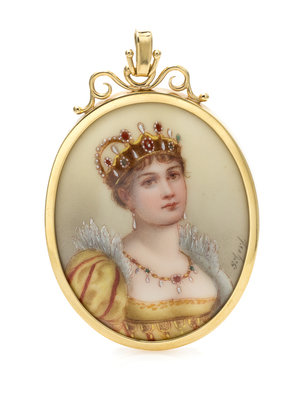 consisting of an oval porcelain portrait miniature depicting Madame Josephine in early 19th century period dress within a yellow gold bezel setting measuring approximately 59.00 x 47.00 mm. Pendant stamp: 18K P.J.Porcelain mark: 57.Porcelain stamp: MA___N GERMANY Madame Josephine.