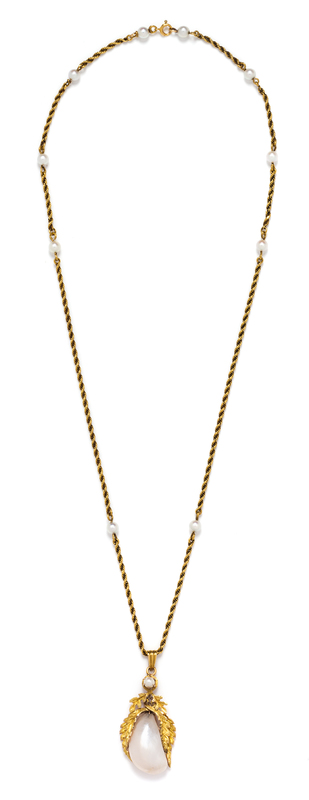 consisting of a central pendant containing a baroque pearl measuring approximately 20.50 x 11.35 mm and one pearl measuring approximately 3.65 mm in diameter within a foliate motif setting, suspended from a yellow gold rope chain interspersed with ten pearls measuring approximately 4.15-4.00 mm in diameter.