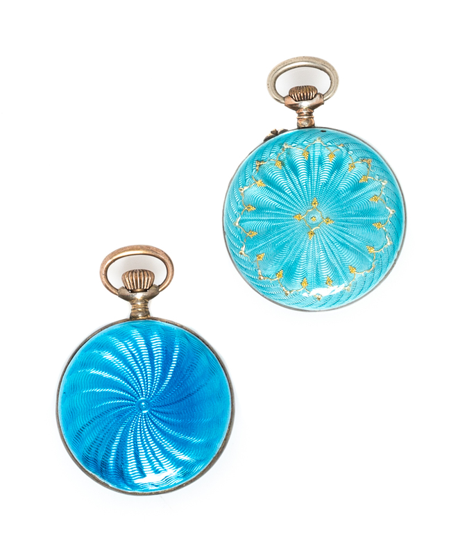 the first pendant watch measuring approximately 28.00 mm case diameter, white dial, Roman numerals, blued steel moon hands, aqua blue guilloche enamel bezel and case back with gold foil accents in a foliate motif, polished bezel, stem wound and pin mechanical movement, the second pendant watch measuring approximately 27.00 mm case diameter, white dial, Arabic numerals, gilt oriental hands, light blue guilloche enamel bezel and case back, polished bezel, stem wound and set mechanical movement.