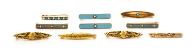 consisting of a pair of bar pins of female profiles with flowing hair and translucent enamel accents, by Krementz & Co., a pair of bar pins with translucent light blue enamel and six small seed pearls by Carter, Gough & Co., a pair of bar pins with opaque light blue enamel and two small seed pearls by Carter, Gough & Co., a bar pin containing five small seed pearls and five cabochon cut turquoise, a bar pin containing one cabochon cut turquoise, a two bar pins with engraved floral designs.