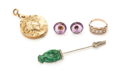 consisting of a French yellow gold slide locket, depicting a bejeweled woman in profile with flowing hair and numerous rose cut diamond accents, the interior compartment holds a mirror and measures approximately 29.00 mm in diameter, a rose gold ring containing four old European cut diamond weighing approximately 0.54 carat total, a pair of earrings containing two flat faceted amethysts surmounted with two seed pearls, together with an Art Deco white gold jabot pin consisting of a moulded green glass figure of an Asian figure wearing a conical hat measuring approximately 22.53 x 14.09 mm and 24 rose cut diamonds.