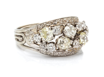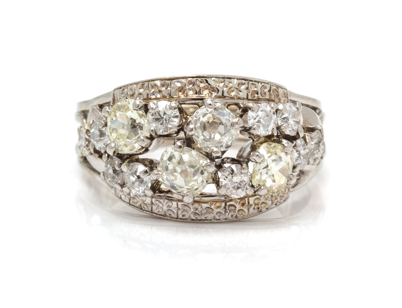 containing 10 old European cut diamonds weighing approximately 0.68 carats total and four old mine cut diamonds weighing approximately 1.41 carats total.