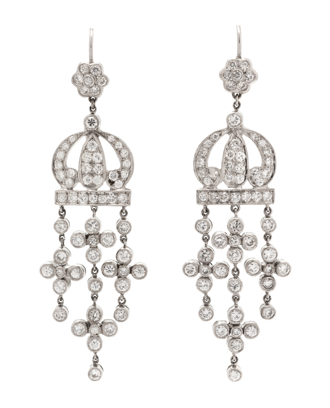 containing numerous round brilliant cut diamonds weighing approximately 2.25 carats total within a crown motif and quatrefoil dangle design with millegrain accents.Scratchmark: AK 78.