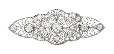 in an intricate open wirework design containing one old European cut diamond weighing approximately 0.46 carat, two old European cut diamonds weighing approximately 0.47 carat total, and 14 old European and old mine cut diamonds weighing approximately 0.58 carat total.