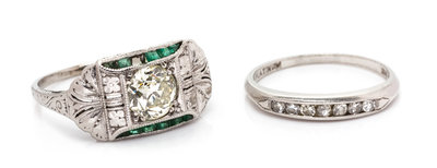 consisting of one ring containing one old European cut diamond weighing approximately 1.13 carats and 11 calibre cut emeralds within an intricate openwork setting with hand engraved detail, together with a band containing seven round single cut diamonds weighing approximately 0.14 carat total.