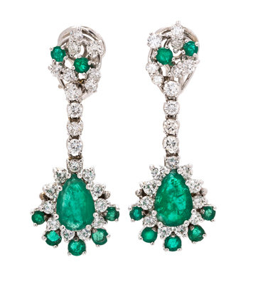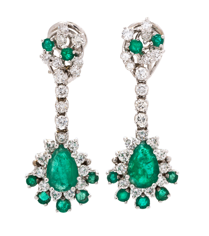 containing two pear shape emeralds weighing approximately 2.35 carats total, 14 round mixed cut emeralds weighing approximately 1.26 carats total, and 44 round brilliant cut diamonds weighing approximately 2.00 carats total.