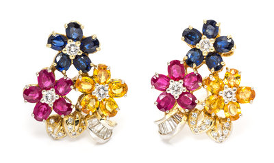 A Pair of Yellow Gold, Sapphire, Ruby and Diamond Floral Motif Earclips,