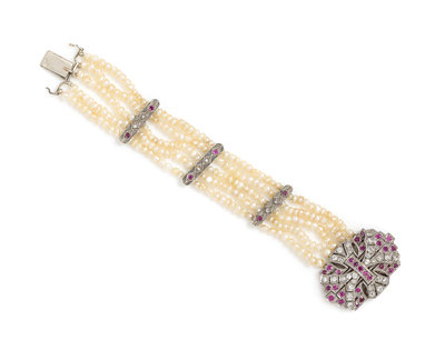 A White Gold, Ruby, Diamond and Seed Pearl Multistrand Bracelet,