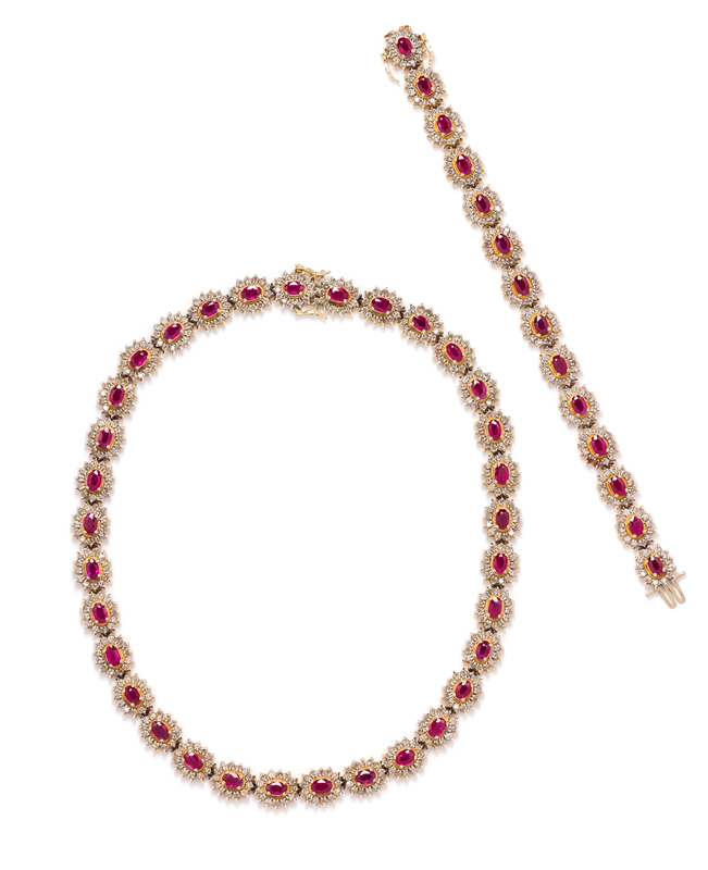 consisting of a necklace and matching bracelet containing 47 oval mixed cut rubies weighing approximately 21.15 carats total and 611 round brilliant cut diamonds weighing approximately 12.22 carats total.Stamp: 14K.