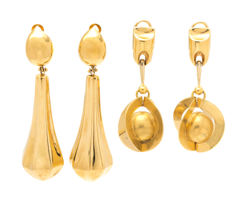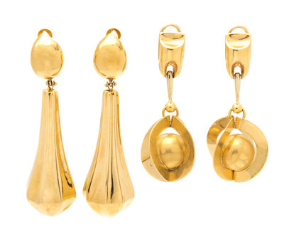 composed of two pairs, one in 18 karat and one in 14 karat, both of elongated hollow form design.