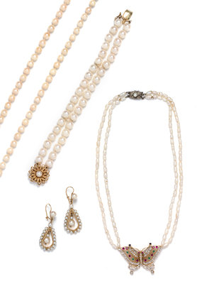 consisting of a double strand bracelet containing 38 pearls measuring approximately 8.30-8.34 mm in diameter strung knotted with two gold spacer beads and a 14 gold clasp, a pair of 14 karat gold pendant earrings containing 40 pearls measuring approximately 3.60-7.01 mm in diameter, a single strand pearl necklace containing 107 pearls measuring approximately 6.73-6.91 mm strung knotted with a 14 karat white gold clasp, together with a double strand pearl necklace with a central 14 karat yellow gold butterfly motif plaque containing 10 round mixed cut rubies measuring approximately 1.39-2.24 mm in diameter, four round mixed cut emeralds measuring approximately 2.11 mm in diameter, two round mixed cut sapphires measuring approximately 1.75 mm in diameter and numerous round single cut diamonds.
