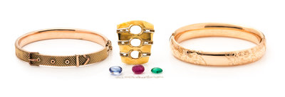 consisting of a rose gold-filled hollow form bangle with embossed foliate details, a 9 karat rose gold belt motif bangle and an 18 carat gold enhancer accompanied by a loose oval cabochon emerald weighing approximately 1.27 carats, a loose oval cabochon cut ruby weighing approximately 2.80 carats, a loose oval cabochon cut sapphire weighing approximately 3.34 carats, and 24 loose round brilliant cut diamonds weighing approximately 0.50 carat total.Enhancer stamp: 750.