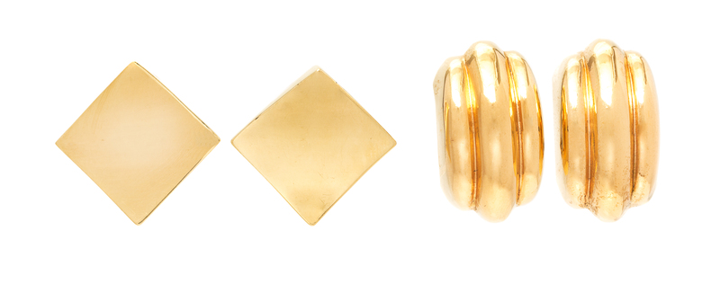 consisting of ribbed half hoop earclips together with a pair of square concave shape earclips.Stamp: 14KCJI.Stamp: 14K.