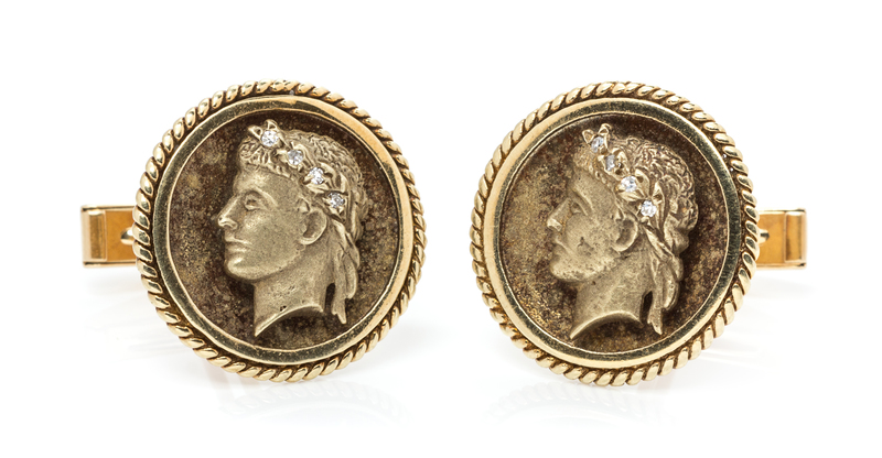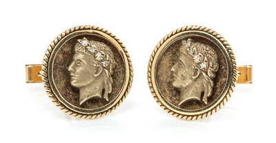 consisting of a pair of cufflinks depicting a Classical male in profile wearing a wreath containing eight round single cut diamonds.Stamp: 14K.
