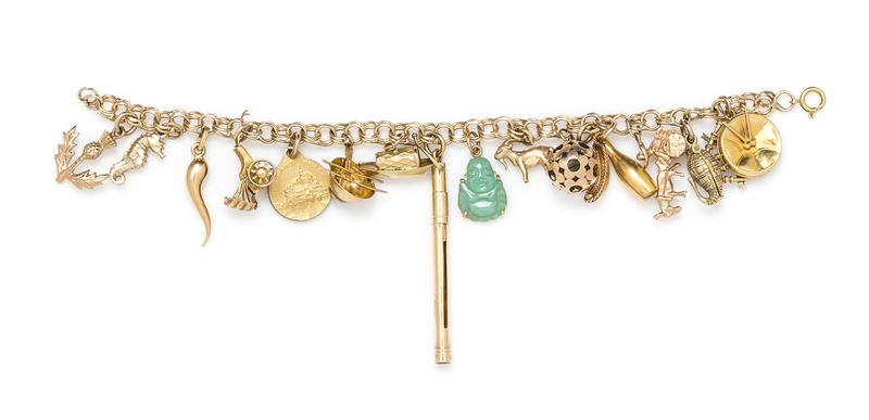 consisting of a steel drum charm, a yellow gold articulated bagpipe charm with enamelled dancer, a 10 karat yellow gold Mexican donkey and cart charm, a curved basket charm, a bowling pin charm, a 14 karat rose gold pierced flower motif bell charm, a goat charm, an 18 karat yellow gold and carved jade Buddha charm, a 14 karat yellow gold retractable toothpick, a Vietnamese sampan boat charm, a 14 karat yellow gold chopsticks and bowl, a Mont Saint Michel charm, a 14 karat yellow gold rickshaw charm, a yellow gold Italian horn charm, a 10 karat yellow gold seahorse charm, and a 9 karat Scottish thistle charm.