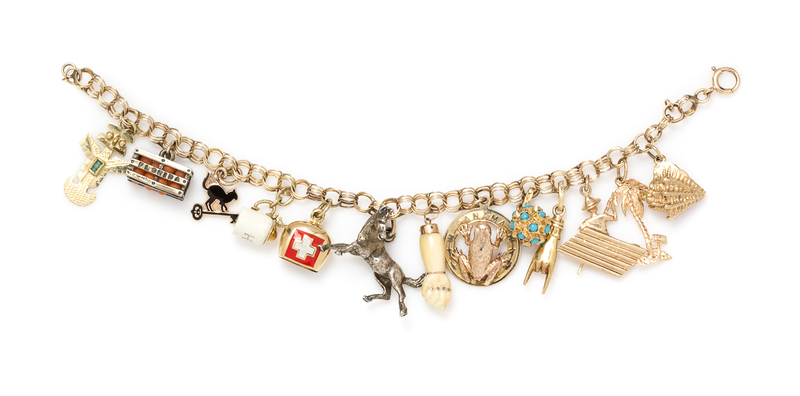 consisting of a 10 karat gold and pink enamel Nassau shell charm, a 14 karat gold palm tree charm, a 14 karat gold man and raft charm, an 18 karat gold mano cornuto charm, a 19 karat gold and turquoise ball charm, a 14 karat gold Panama frog charm, an 18 karat gold and bone figa charm, a metal stallion charm, a yellow gold and polychrome enamel Swiss cow bell charm, a 14 karat gold and resin beer stein charm, a 10 karat gold and enamel cat and key charm, a sterling silver Florida orange crate charm, together with an 18 karat gold and emerald Mesoamerican charm.