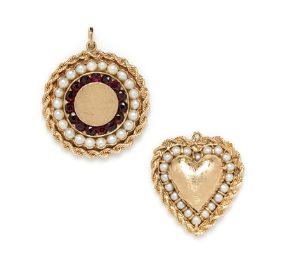 consisting of a heart shape locket charm containing 20 pearls measuring approximately 4.00 mm in diameter with a rope chain border, together with a round charm containing 15 round mixed cut garnets measuring approximately 4.25 mm in diameter and 22 pearls measuring approximately 4.23 mm in diameter with a rope chain border.