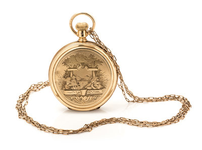 40.00 mm case dimensions, white enamel dial signed Elgin, Roman numerals, blued steel spade hands, subdial for seconds at 6 o'clock, rose gold case with engraved village scene and blank cartouche, polished cuvette, stem wound and lever set 13 jewel set gilt lever movement, together with a rose goldfilled oval link longchain.Movement number: 2930092.Case number: 1790.