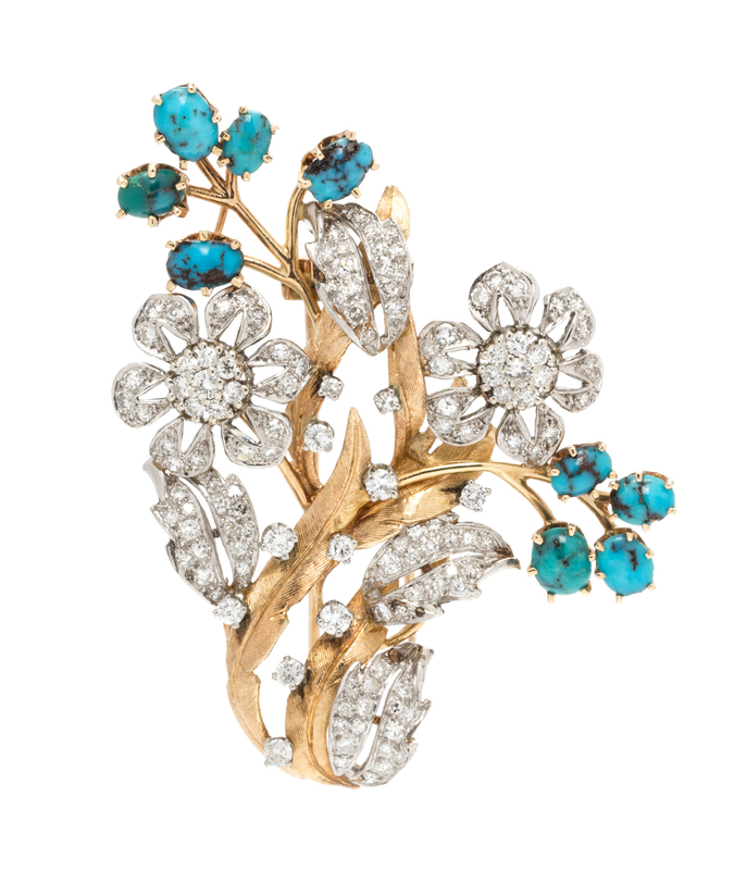 A 14 Karat Bicolor Gold, Diamond and Turquoise Floral Motif Brooch,