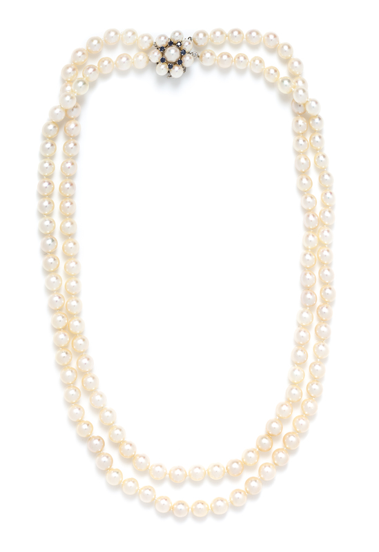 A Double Strand Cultured Pearl Necklace with White Gold and Sapphire Clasp,